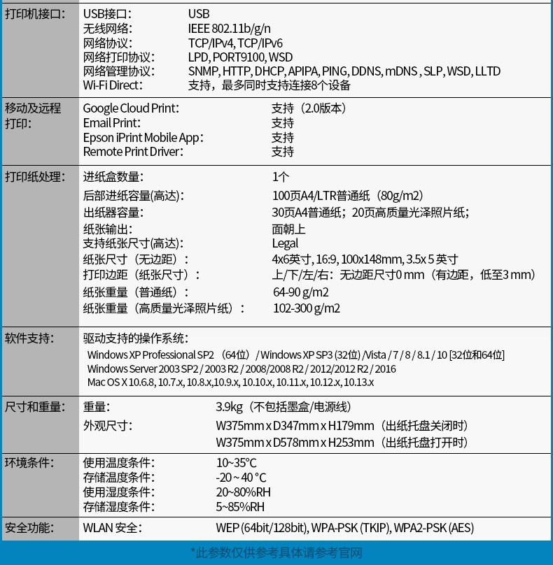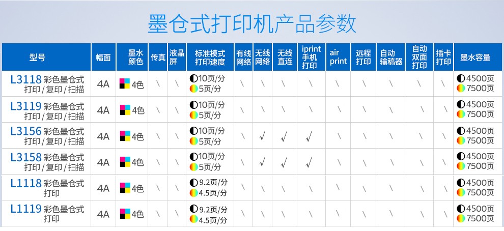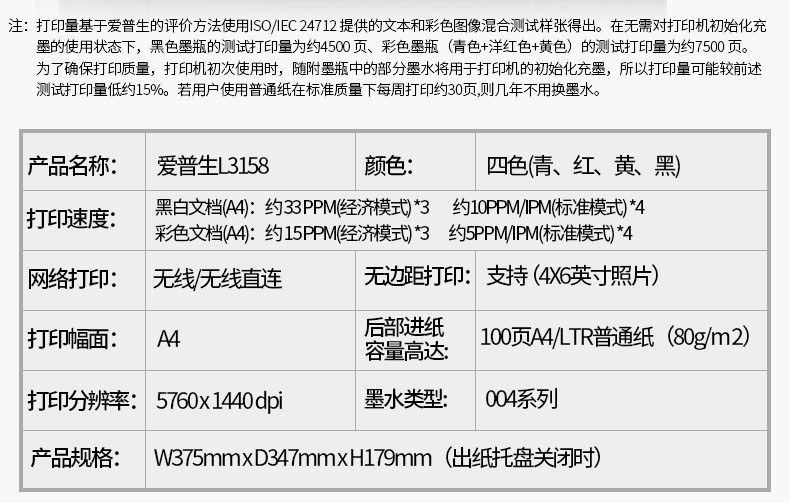 品牌 : 愛普生 型號(hào) : L3158 1 品牌: 愛普生(EPSON)商品名稱:愛普生L3158商品毛重:6.5kg商品產(chǎn)地:菲律賓技術(shù)類型:墨倉/加墨式打印連接方式:無線,USB幅面:其他耗材類型:墨水自動(dòng)雙面打印:不支持使用場景:家庭打印,照片打印,家庭辦公,小型商用,大型辦公,其他 進(jìn)度: 0% 全屏 更多參數(shù)>>